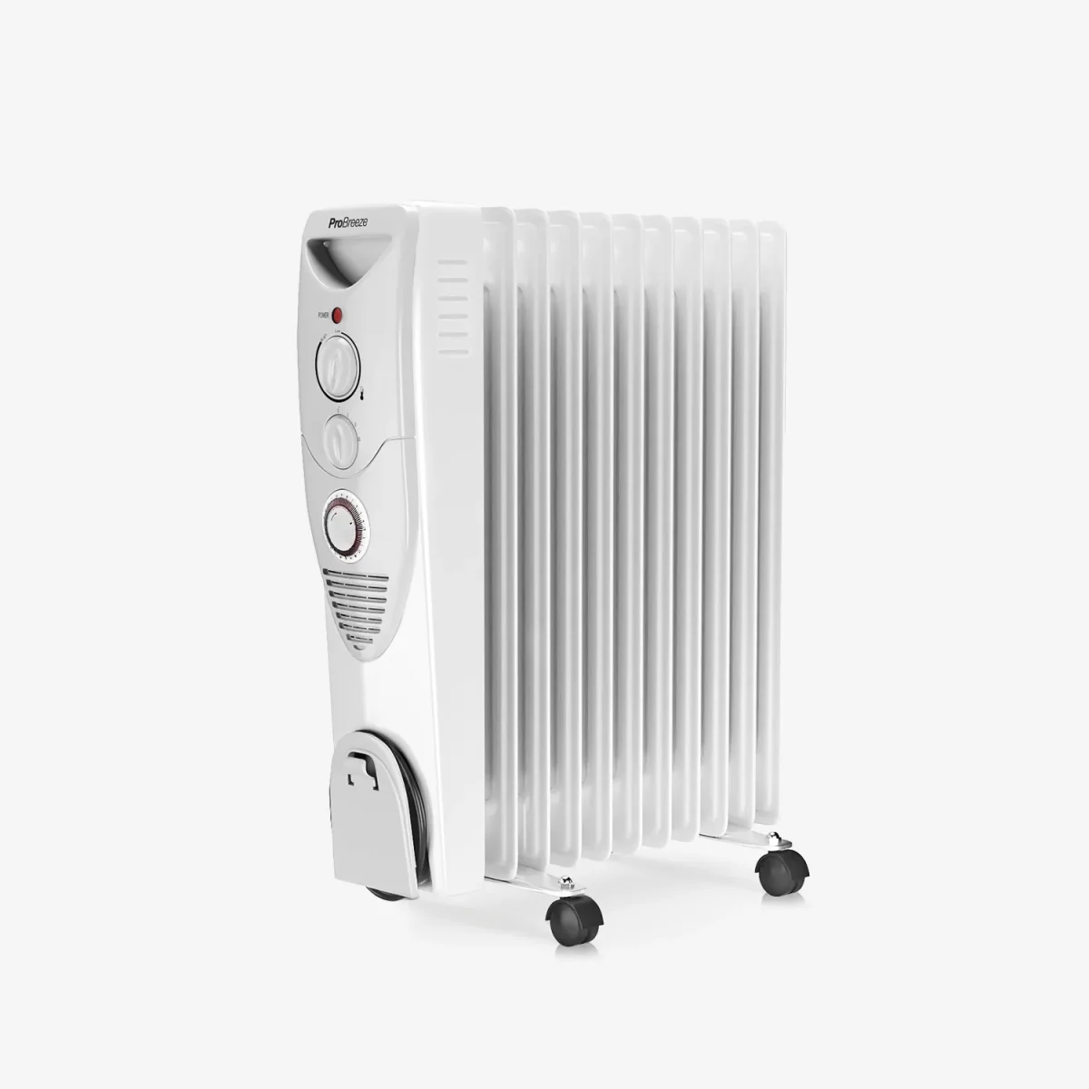 This 2500W Oil-Filled Radiator quickly and efficiently warms up rooms of all shapes and sizes. Featuring 11 oil-filled fins, it’s perfect for keeping your bedroom, living room, home, or office warm. Oil-filled radiators are ideal for rooms that require heating over a sustained period and offer a low-cost heat solution compared to the running of a regular fan heater.