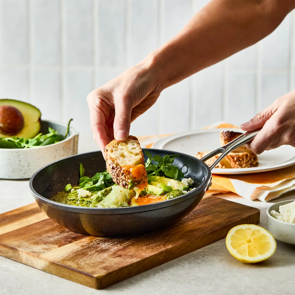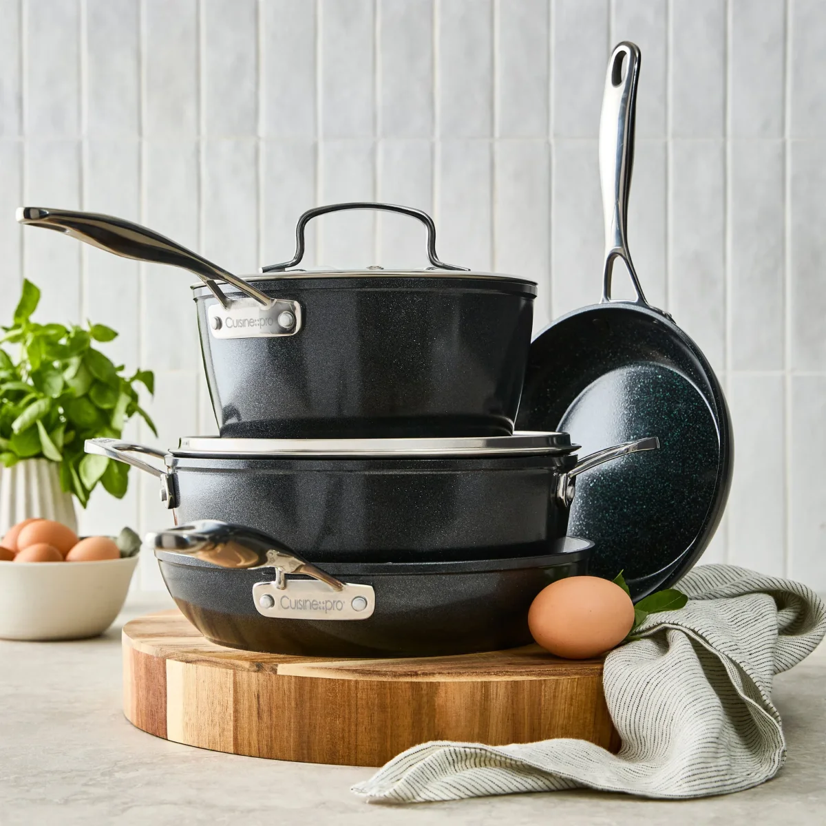 Cette batterie de cuisine 6 pièces réunit les essentiels pour la cuisson quotidienne, que ce soit pour frire des œufs, mijoter des sauces ou préparer des plats en casserole. Chaque pièce est fabriquée en aluminium forgé et dotée d’un revêtement antiadhésif en céramique de 7e génération, garantissant une cuisson 100 % sans toxines et un nettoyage facile. Les rivets plats créent une surface intérieure lisse, les poignées en aluminium coulé restent froides au toucher, et les couvercles en verre trempé permettent de surveiller la cuisson. Compatible avec toutes les surfaces de cuisson, incluant induction, et résistante au four jusqu’à 220 °C.