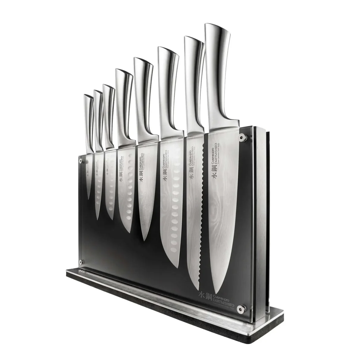Idéal pour équiper une cuisine haut de gamme, ce bloc de couteaux magnétique réunit une sélection complète de couteaux en acier japonais premium, élégamment présentés sur un bloc en bois d’acacia avec panneaux transparents. Forgées avec précision et trempées à froid pour une durabilité accrue, les lames inspirées du style damassé offrent finesse, équilibre et contrôle pour toutes les tâches culinaires.