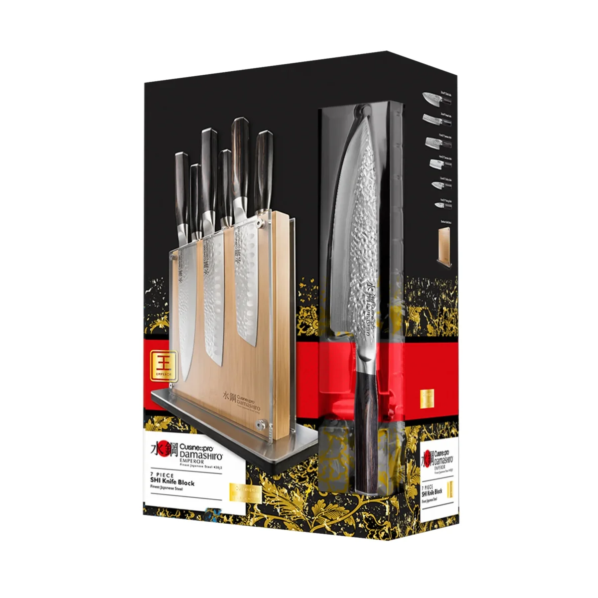 Les lames sont fabriquées en acier inoxydable japonais 420J2 et présentent une finition martelée tsuchime inspirée des couteaux traditionnels japonais. Elles sont affûtées selon un angle de 15 à 20° pour une coupe précise et sont trempées à froid pour atteindre 53 HRC sur l’échelle de dureté de Rockwell.