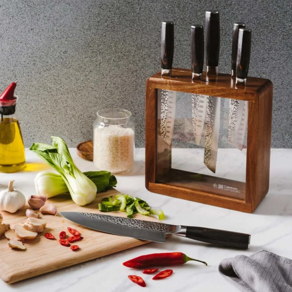 Ensemble de couteaux haut de gamme conçu pour les usages essentiels en cuisine. Les lames en acier japonais offrent une coupe précise et durable, tandis que le bloc Mokuzai en bois et acrylique permet un rangement sécurisé et une mise en valeur élégante.