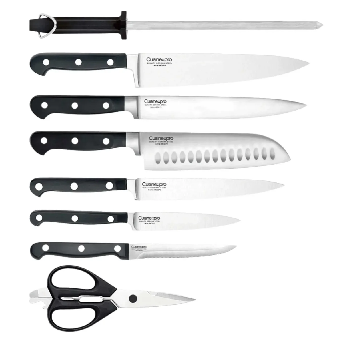 Bloc de couteaux complet offrant une sélection polyvalente de lames en acier inoxydable allemand, élégamment disposées dans un bloc en bois pour un rangement pratique et raffiné. Conçus pour assurer une excellente durabilité, un tranchant longue durée et un contrôle optimal, ces couteaux présentent une dureté de 55 HRC. Les manches à triple rivet avec protège-doigts améliorent la sécurité et l’équilibre, faisant de cet ensemble un choix fiable pour un usage quotidien.