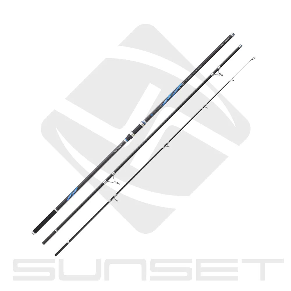 Les cannes surfcasting SUNSET OCEANA REVOLUTION SURF POWER possèdent un blank en trois éléments en carbone “Technifibre” Haut Module 24T + 30T, un pommeau en aluminium, une poignée antidérapante “soft touch”, un porte-moulinet tubulaire Fuji DPS-M argenté, des anneaux ligaturés anti emmêlement Fuji “KW” Alconite, un scion “Power” pour un maximum de puissance et un étui en nylon.