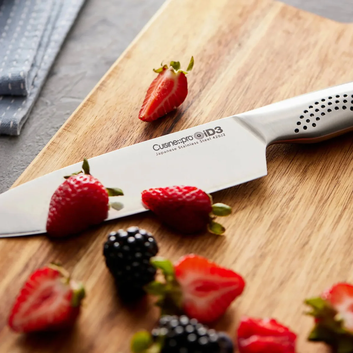 Le couteau de chef iD3® 15,2 cm (6 po) de Cuisine::pro® est une version compacte et agile du couteau de chef traditionnel. Sa lame plus courte offre un excellent contrôle pour les tâches nécessitant précision et rapidité, comme trancher, hacher ou émincer les ingrédients.
