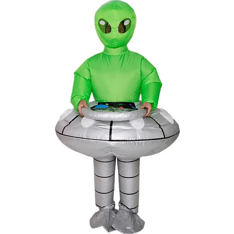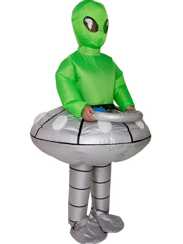 Avec ce déguisement, vous aurez l’impression d’être un extraterrestre venu d’un autre monde à bord de sa soucoupe volante grise. Il est même équipé d’un tableau de bord devant vous, mais attention à ne pas toucher au bouton rouge ! Ce costume gonflable est adapté aux adultes de 150 cm à 190 cm.
