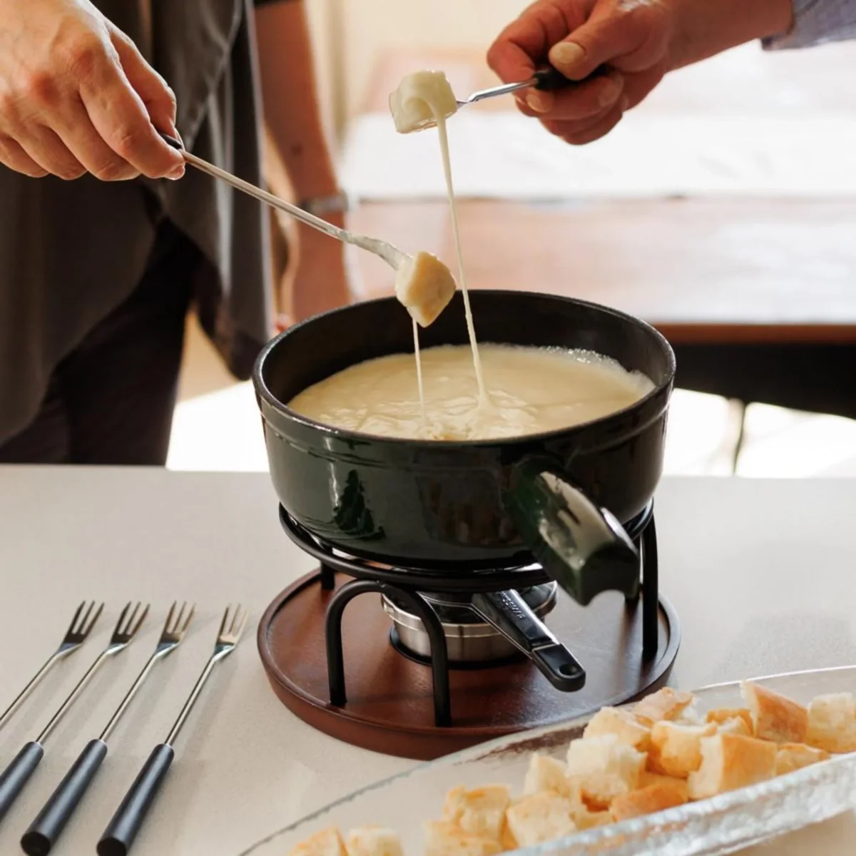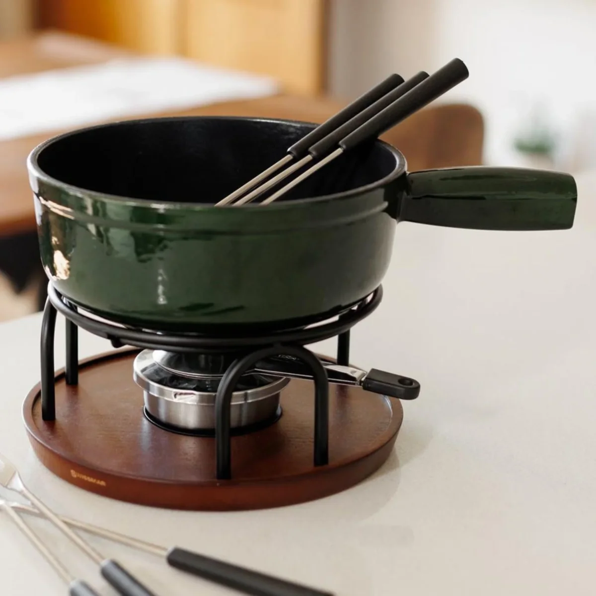 Le réchaud moderne est accompagné d’un plateau en bois de hêtre certifié FSC qui protège la table et ajoute une touche chaleureuse à la présentation. Les six fourchettes en acier inoxydable résistantes à la chaleur permettent à chaque convive de profiter facilement de la fondue.