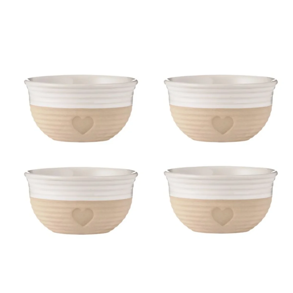Cet ensemble de 4 bols mini Rustic Charm de Mason Cash apporte une touche champêtre élégante à votre cuisine. Fabriqués en grès, ces bols présentent de délicats motifs cœur embossés ainsi qu’un mélange harmonieux de finitions mates et brillantes dans des tons neutres. Leur format compact de 150 ml est idéal pour la préparation, les portions individuelles, les sauces ou les desserts. À la fois pratiques et esthétiques, ils passent facilement de la cuisine à la table.
