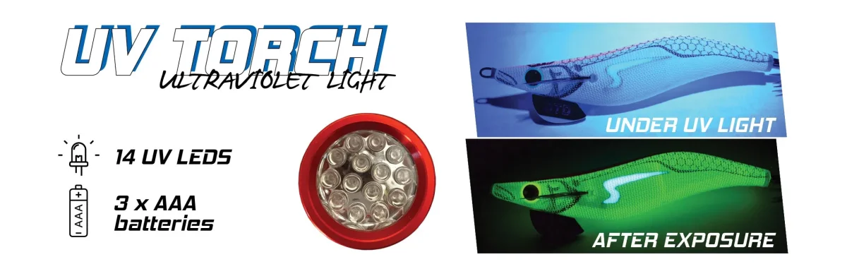 Une lampe ultraviolette conçue pour fournir une charge rapide et durable aux surfaces phosphorescentes. La lumière ultraviolette « surchargera » les leurres de calmar lumineux. 14 LED longue durée, corps en aluminium robuste, 3 piles AAA. Parfait pour une utilisation avec des leurres de pêche UV.