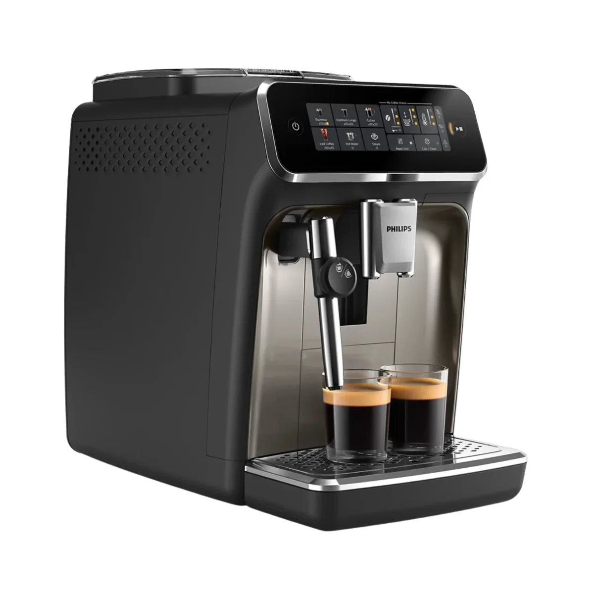 Machine espresso entièrement automatique offrant 5 boissons chaudes et glacées d’une simple touche : espresso, café, americano, espresso lungo et café glacé, ainsi que de l’eau chaude et du lait chaud. Le mousseur à lait classique ( buse ) prépare une mousse épaisse pour cappuccinos ou du lait chaud pour chocolat chaud. L’écran tactile intuitif permet de sélectionner et de personnaliser facilement la boisson via My Coffee Choice (force, longueur et niveau de mousse). Le broyeur céramique durable propose 12 niveaux de mouture et le filtre AquaClean permet jusqu’à 5000 tasses sans détartrage lorsqu’il est remplacé selon l’indication. La technologie SilentBrew réduit le bruit pour une expérience plus agréable.