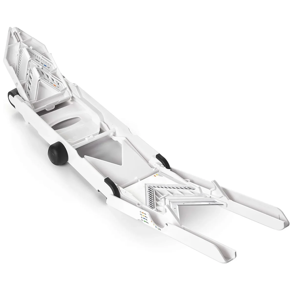 Compacte et pratique, la mandoline se verrouille et ses pieds se replient pour un rangement sécurisé.