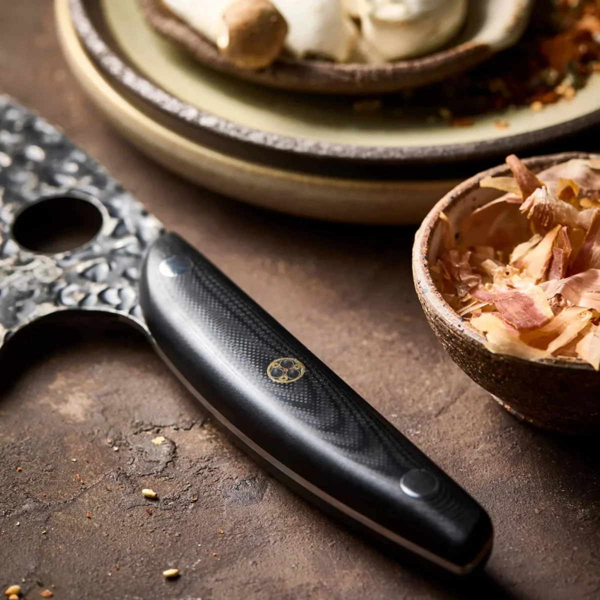 Fabriqué en acier inoxydable japonais 420J2, il combine résistance et performance, tandis que sa finition martelée tsuchime aide à ce que les aliments ne collent pas. Son manche en G10 triple riveté assure une prise en main stable et confortable.