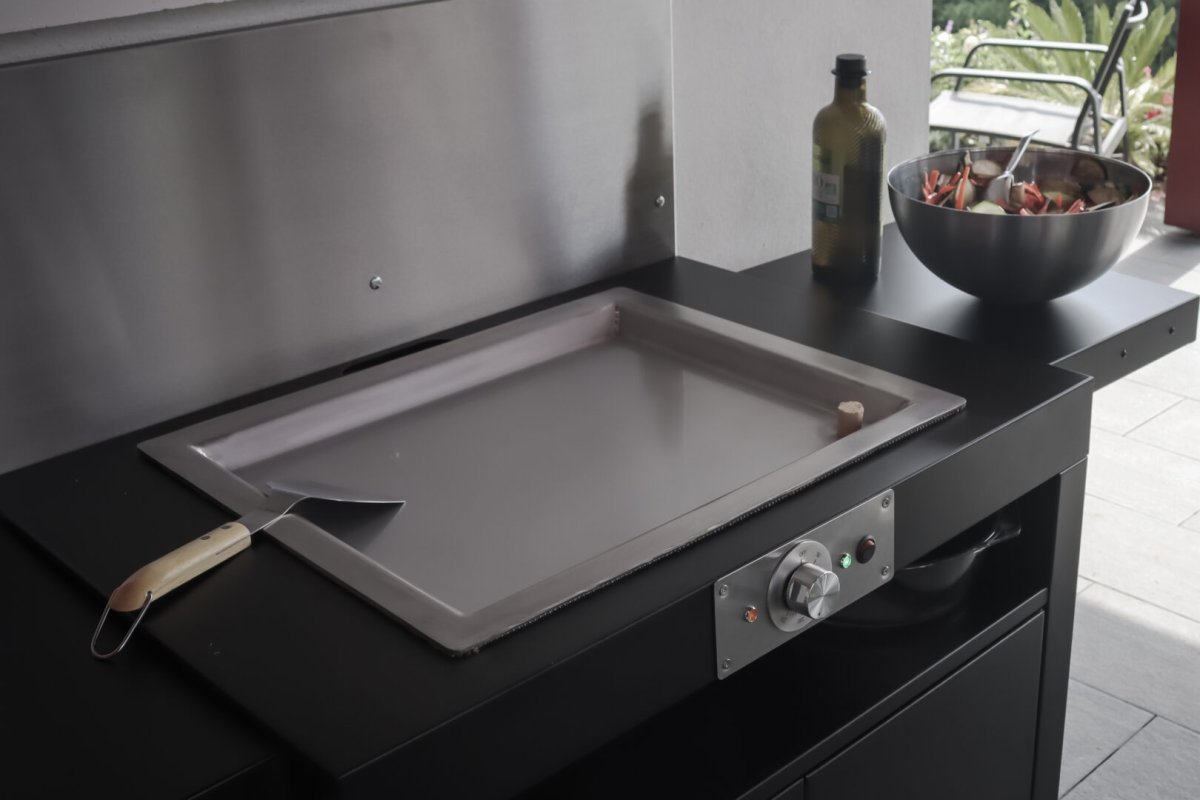 Notre plancha électrique encastrable 100% inox est un produit de qualité et professionnel. C’est une plancha à inertie. Ce système permet d’avoir une zone de chauffe beaucoup plus homogène sur la plaque de cuisson. Il évite aussi de perdre de la puissance lors de la chauffe des aliments. De part son design soigné au caractère du Pays Basque, elle s’intégrera parfaitement à votre mobilier d’intérieur comme d’extérieur. Euskal Plantxa fait le choix d’une plancha 100% inox, un matériau utilisés par les cuisiniers professionnels, qui vous permettra une cuisine saine sans matière grasse, de découper vos aliments directement sur la plaque et un nettoyage facile de votre plaque de cuisson.