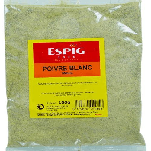 Poivre blanc moulu idéal pour vos plats et sauces. Il est plus fin et moins piquant que le poivre noir.