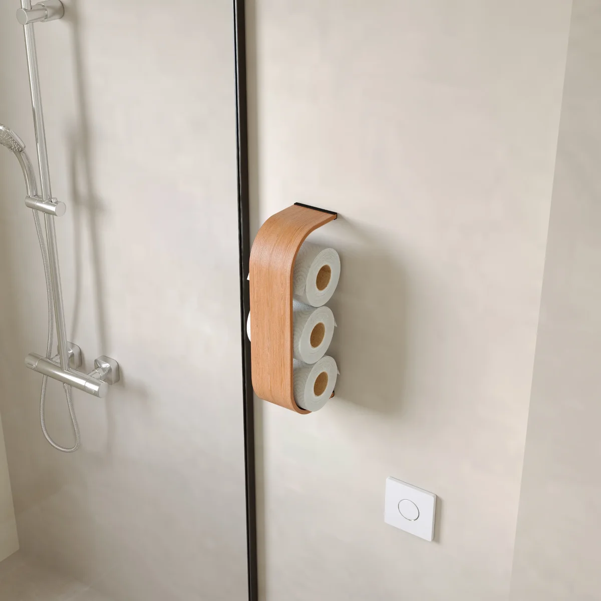 Le porte-rouleaux de papier toilette est fabriqué à partir de contreplaqué de bouleau de la Baltique fini avec différents placages de bois, ce qui garantit sa qualité, sa durabilité et son esthétique intemporelle.
