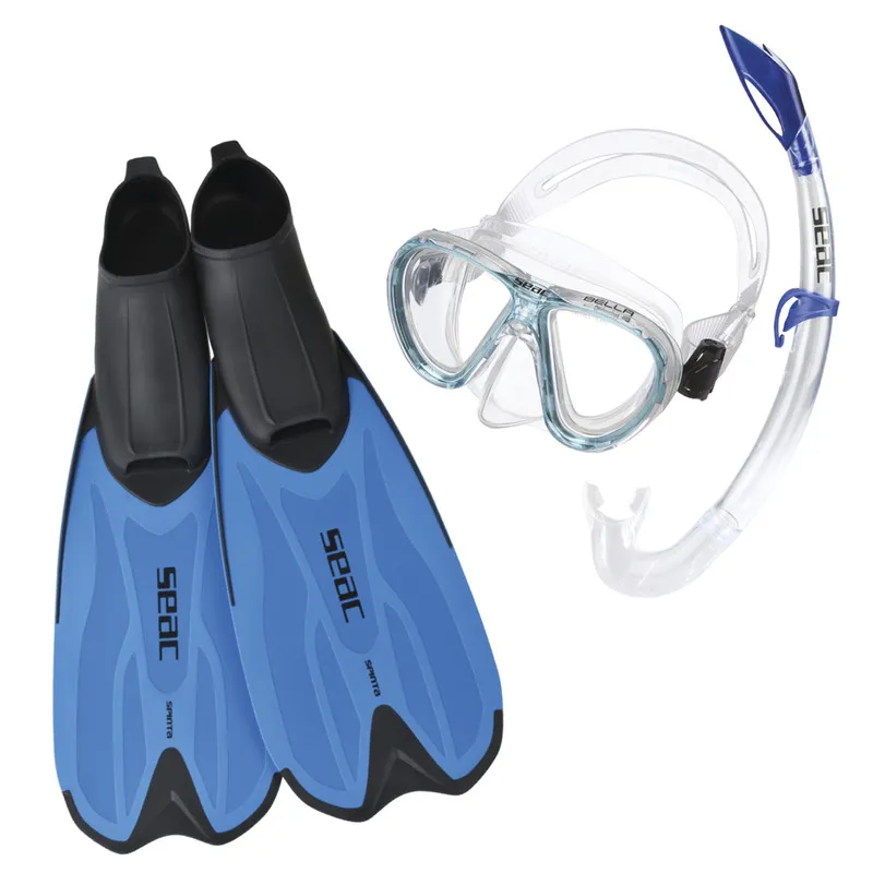 - Selon la taille choisie, l’ensemble comprend un masque de plongée Seac Elba (de la taille 40/41 à 46/47), Seac Elba MD (de la taille 34/35 à 38/39) ou Seac Bella pour les enfants (tailles 28 / 30 et 31/33).