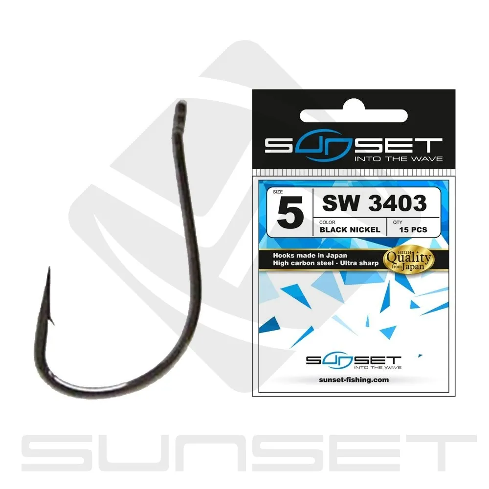 Les SUNSET SUNHOOKS SW 3403BN sont des hameçons très fins de fer, à œillet et ils sont idéals pour escher des appâts fragiles. Munis d’un traitement en black nickel pour une résistance optimale à la corrosion, les SUNSET SUNHOOKS SW 3403BN sont disponibles du n°2 au n°8. Les hameçons SUNHOOKS SW sont fabriqués au Japon, en acier haut de gamme et à haute teneur en carbone pour une résistance maximale et un piquant hors norme durable dans le temps. our maintenir les appâts sur les hameçons SUNHOOKS, pensez à utiliser le FIL ELASTIQUE SUNSET !
