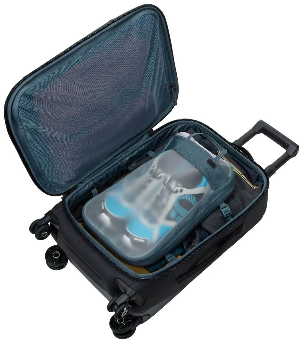 Inclut un cube d’emballage compressé amovible doublé TPU pour séparer les affaires odorantes, humides et sales du reste du sac et qui sert également de sac d’appoint